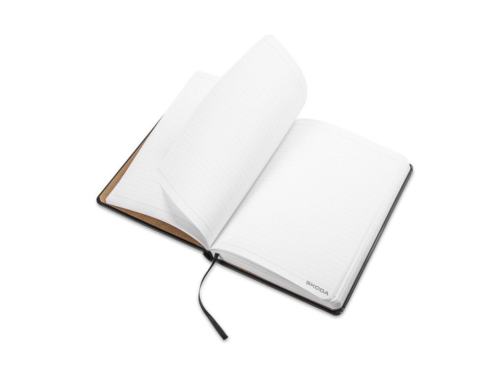 Formát A5 ukrývá 192 linkovaných stran z recyklovaného papíru, každou s decentním logem Škoda v dolním pravém rohu.